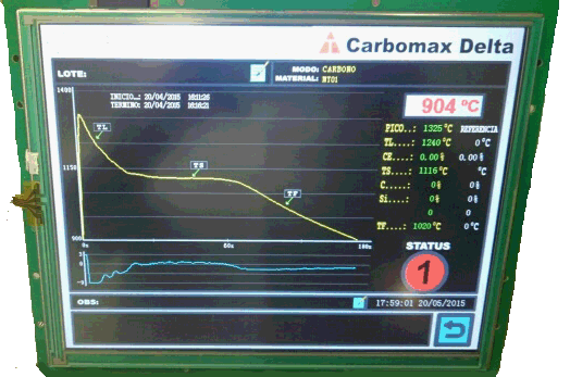 The working principle comes from the molten iron thermal analysis cooling curve of a sample collected from the furnace/ladle and poured into a tellurium cup. Through the analysis of the "Liquidus" and "Solidus" temperature arrests, the instrument presents in less than 3 minutes the carbon Equivalent, Carbon and Silicon percentages on the melting floor. The CARBOMAX II operation is very simple and the preset parameters allows a "plug and Go" without any prior adjustment.